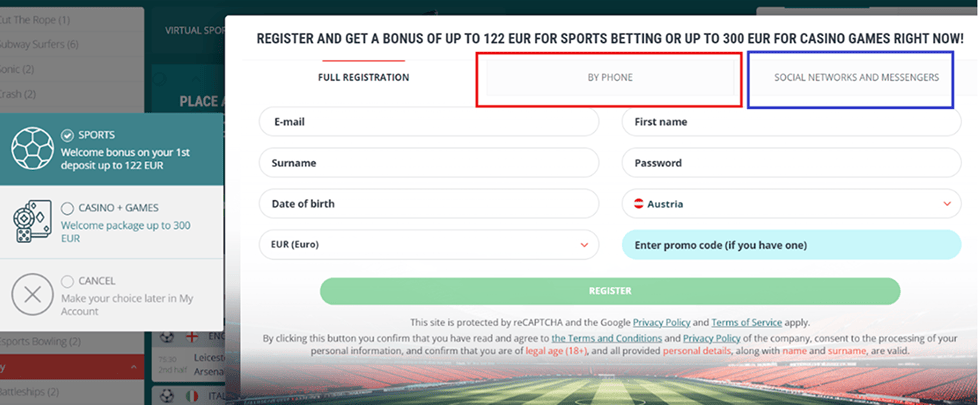 Stačí najít tlačítko pro registraci na hlavní webové stránce a zahájit proces. Můžete se rozhodnout pro úplnou registraci nebo rychlou registraci pomocí svého telefonního čísla nebo profilu na sociálních sítích.