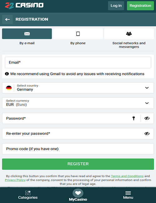 22Casino je ena redkih igralnic, ki ponuja več načinov registracije. Ustvarite račun lahko prek e-pošte, telefona ali preko družbenih omrežij ter sporočilnih aplikacij. Postopek registracije je preprost in intuitiven, zato se lahko tudi popolni začetniki brez težav pridružijo igralnici.